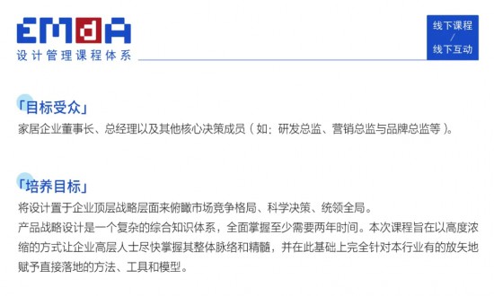 收獲新的能力需要企業(yè)上下一心,具體而言就是要達到?jīng)Q策層和執(zhí)行層共同學習的效果。我院此次推出的課程針對企業(yè)的兩個群體分別設置了對應課程體系——即EMDA設計管理課程體系和SFD夏/冬主案設計師集訓營: