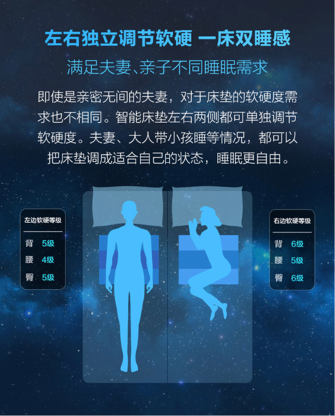 可以看出這款智能床墊與傳統(tǒng)床墊區(qū)別點(diǎn)主要在于,傳統(tǒng)床墊很難根據(jù)不同人的需求做到對(duì)應(yīng)調(diào)節(jié), 而智能床墊能做到個(gè)性化匹配。據(jù)悉小米眾籌即將上線這款床墊,根據(jù)人工智能算法,通過床墊內(nèi)置AI睡眠系統(tǒng),能自動(dòng)感知人體數(shù)據(jù),算出適合身體的氣囊氣壓值,軟硬調(diào)節(jié)系統(tǒng)控制獨(dú)立6分區(qū)每個(gè)氣囊需要的空氣容量,20秒完成床墊軟硬度調(diào)節(jié),也就是能根據(jù)你的體態(tài)選擇出“適合你的床墊”。