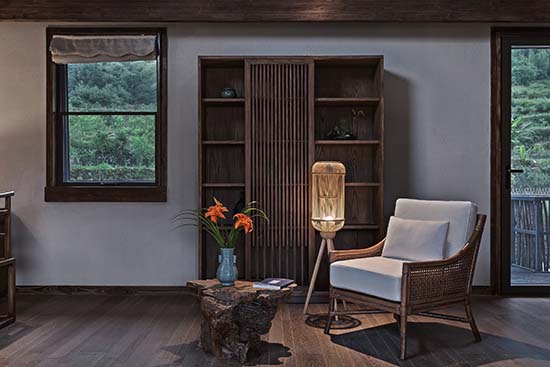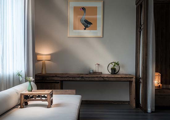 周赫:旗山俠隱的地理位置是在浙江遂昌,山林盡處的古村落里,遂昌本來就是一個(gè)有著1800年歷史的美麗山城。被譽(yù)為“東方莎士比亞”的戲劇大師湯顯祖在此主政5年,創(chuàng)作了不朽名著《牡丹亭》。項(xiàng)目所在的地方跟龍泉市交界,“龍泉寶劍”“龍泉青瓷”都是屬于國家非物質(zhì)文化遺產(chǎn)。項(xiàng)目所在的村子向來都有習(xí)武的傳統(tǒng),并且保留至今??梢哉f,這里是一個(gè)人文薈萃之地。我們是在建設(shè)之初就進(jìn)駐到項(xiàng)目里,深度的考察了當(dāng)?shù)氐母鞣N人文和歷史傳統(tǒng),讓它們適宜的出現(xiàn)在我們的設(shè)計(jì)里,讓來這里入住的人們能夠切身的體驗(yàn)感受到歷史文化的浸潤。在家具和陳設(shè)上大量使用了老榆木,并使用當(dāng)?shù)貍鹘y(tǒng)的匠人技術(shù),純手工打磨,使其具有記憶的紋理。同時(shí)我們也在居民家中回收了一些具有歷史感的老物件,比如榆木小幾,老食盒等。另外,我們選用了當(dāng)?shù)鼐哂刑厣闹袼囈约熬哂?70年歷史的古窯坊青瓷作為客房里的陳設(shè)和一些符號(hào)元素。所有這些,都不是簡(jiǎn)單的堆砌,而是深入到歷史中,去思考它們存在的方式和意義。通過最謙卑的方式來呈現(xiàn)其本真,在做到舒適的體驗(yàn)下盡可能保留過去的記憶和紋理。
