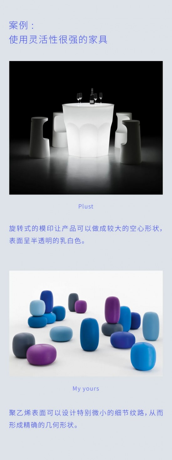 由于聚乙烯材料的特性,因此可以用來生產(chǎn)特別的形狀或大尺寸的產(chǎn)品。如果設(shè)計人員需要一種靈活性很強的材料,那聚乙烯是一種很好的解決方案。它也是一種可大量染色的材料,還可以在印刷后涂漆。因此,采用這種材料可以設(shè)計出不同效果的產(chǎn)品,啞光的或亮光的,光滑或具有浮雕微紋理等。