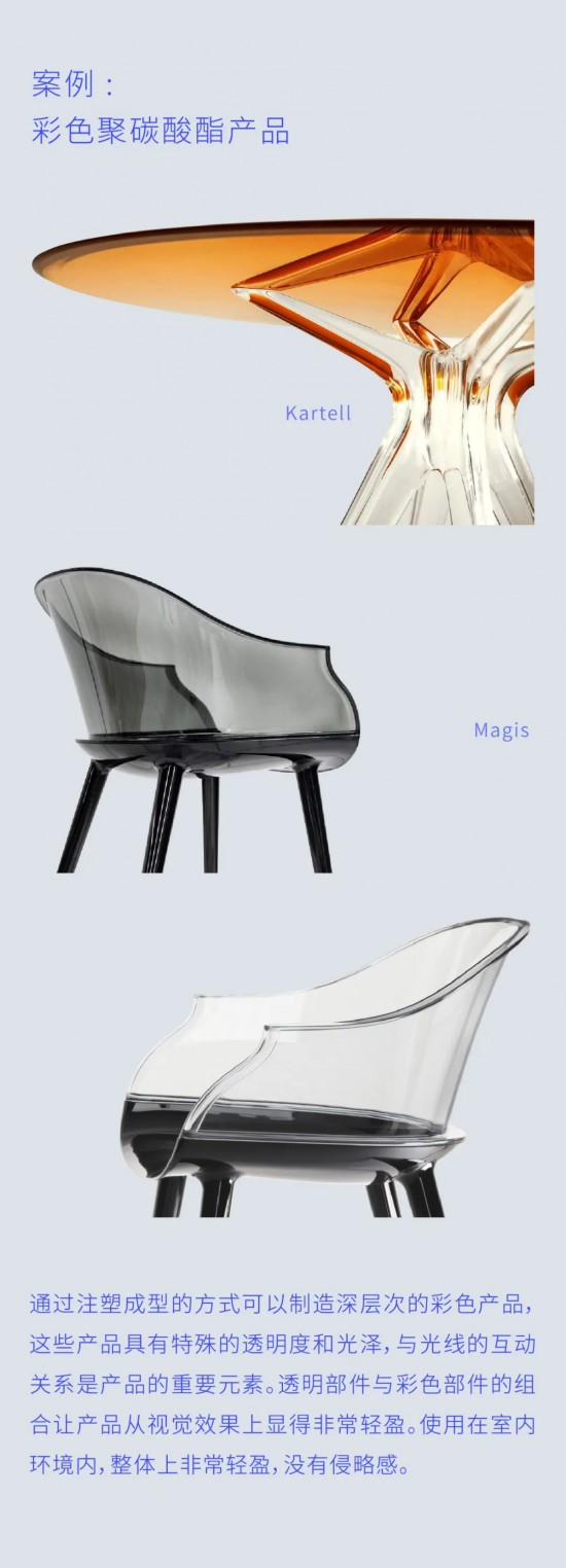 當設(shè)計師想像一種產(chǎn)品或塑料半成品具備透明且反光的特性,有點像吹制玻璃時,可以考慮聚碳酸酯材料。不論是模制或是擠制的都有類似效果。聚碳酸酯可以用于制造產(chǎn)品或者室內(nèi)裝飾,特點是具有很高透明性,色彩豐富還有反光效果,表面堅硬??梢誀I造一個特點鮮明的居住空間。