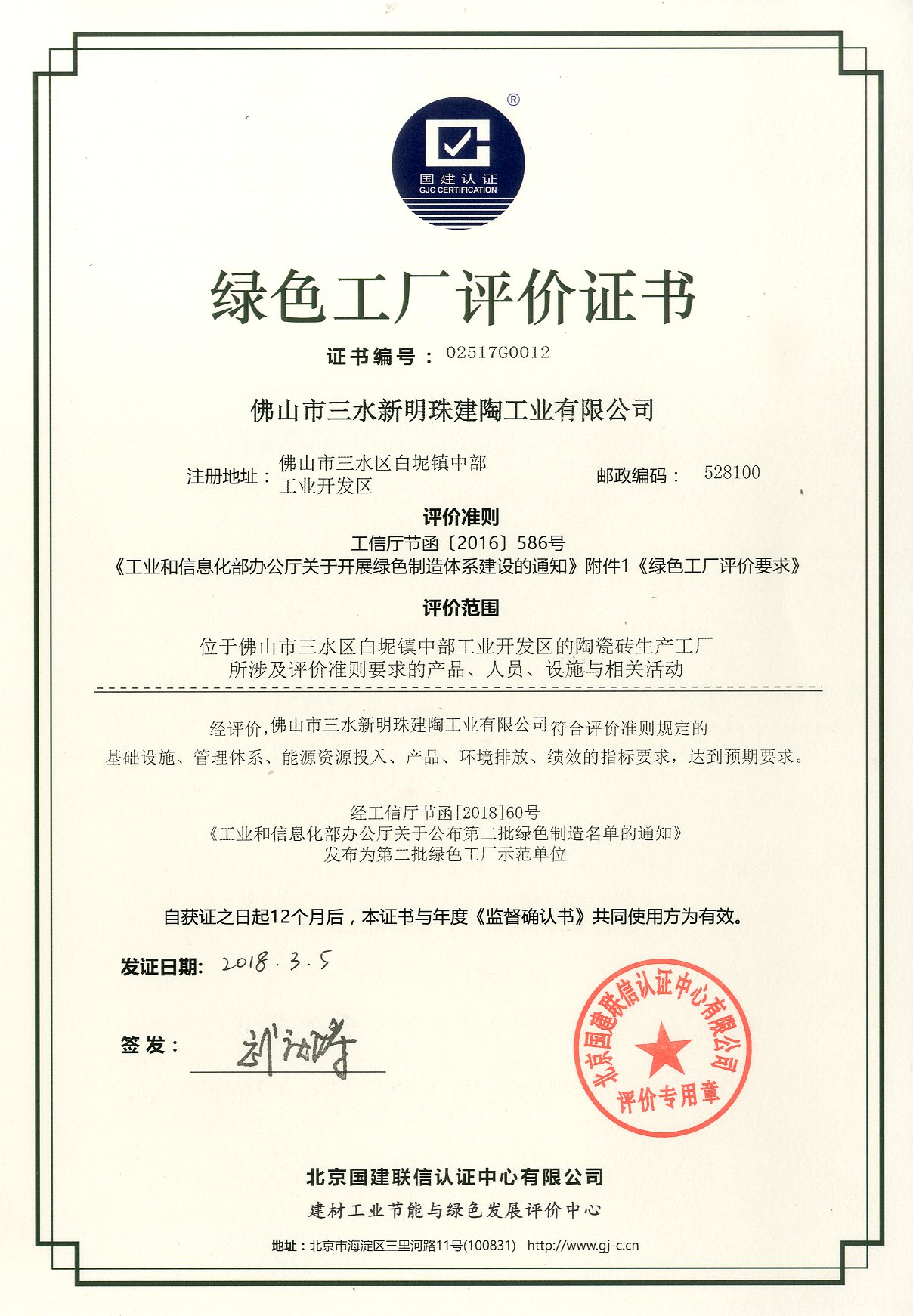 綠色工廠評價證書