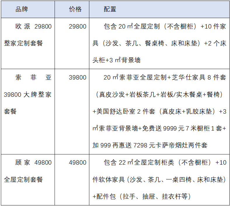 以市面上最主流的歐派、索菲亞、顧家3大品牌的整家定制套餐為例:(說(shuō)明:歐派和顧家都是單個(gè)套餐,而索菲亞39800針對(duì)不同用戶需求設(shè)置了4款配置,以最核心的索菲亞大牌整家套餐來(lái)舉例對(duì)比):