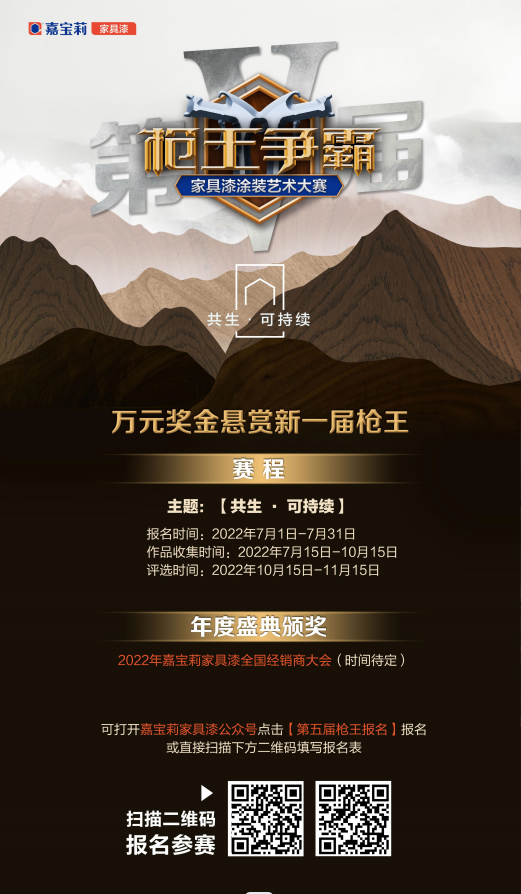 1、每個(gè)階段參賽選手在賽程中提交至少2塊參賽樣板和提交紙質(zhì)版與電子版《嘉寶莉家具漆第五季槍王爭霸賽涂裝工藝流程表》。