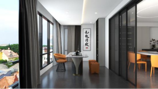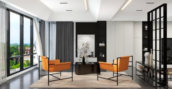 落地窗引景入室,兩張CBD家居·金豹 | J001單椅,愛馬仕橙色洋溢時(shí)尚氣息,構(gòu)型線條感十足,將藝術(shù)與實(shí)用性完美結(jié)合,穩(wěn)固性俱佳。風(fēng)動(dòng)簾,可靜坐望遠(yuǎn),享受愜意時(shí)光。