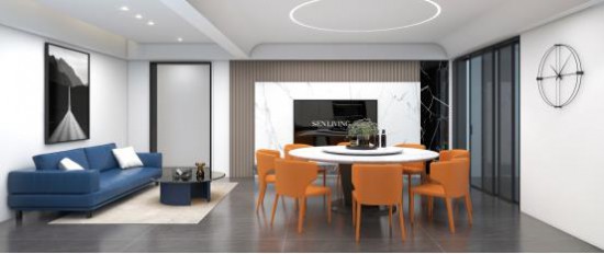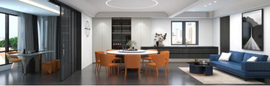 CBD家居· 黑金 | HG571餐桌,大理石圓桌面溫潤有型,演繹家的溫情,可旋轉(zhuǎn)圓盤設(shè)計(jì)增強(qiáng)實(shí)用性,橙色餐椅點(diǎn)綴,活躍用餐氛圍;CBD家居·黑金 | HZ089沙發(fā),藍(lán)色清雅十足,一字型靠墻排列,豐富空間美感和功能性。