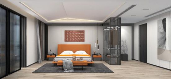 透明衣柜集收納性與美觀度于一身,提高空間質(zhì)感。CBD家居·金豹 | J076軟床,愛馬仕橙色時(shí)尚氣息濃郁,靜置其間,喚醒臥室的獨(dú)特魅力,一體式高床屏精巧別致,搭配纖薄床框、簡約床尾凳,營造怡然舒緩的睡眠氛圍。
