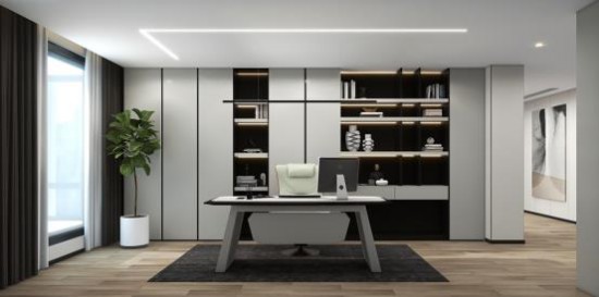 學(xué)習(xí)辦公區(qū)設(shè)計(jì)簡約,冷色調(diào)沉靜十足,定制柜體合理劃分,置物收納整潔有序,定制CBD家居·金豹 | J070辦公桌,觀感高級,更具實(shí)用性,符合居主的品味與生活習(xí)慣。