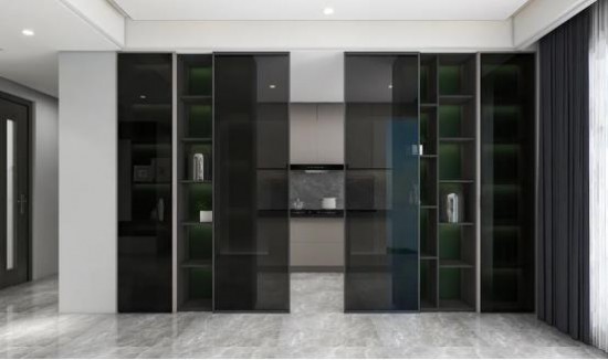 極致收納,于廚房可見。廚房門采用深色玻璃推拉設計,彰顯空間格調,更妙儲物收納功能的處理,化墻面為置物架,書籍、飾品擺放,擁有裝飾效果也提高空間實用性。