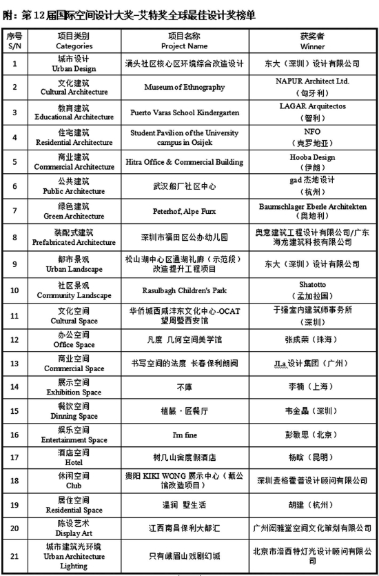 核心提示:第12屆國際空間設計大獎艾特獎頒獎盛典全球直播,21項作品攬得大獎.