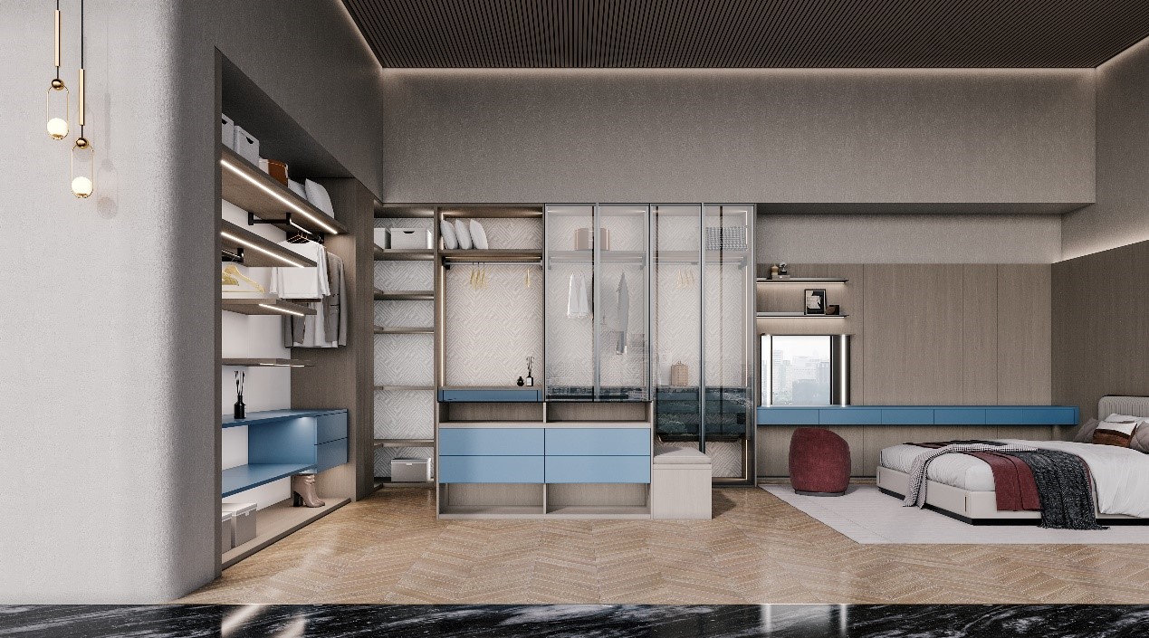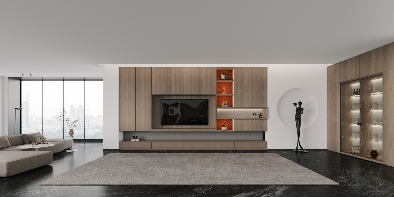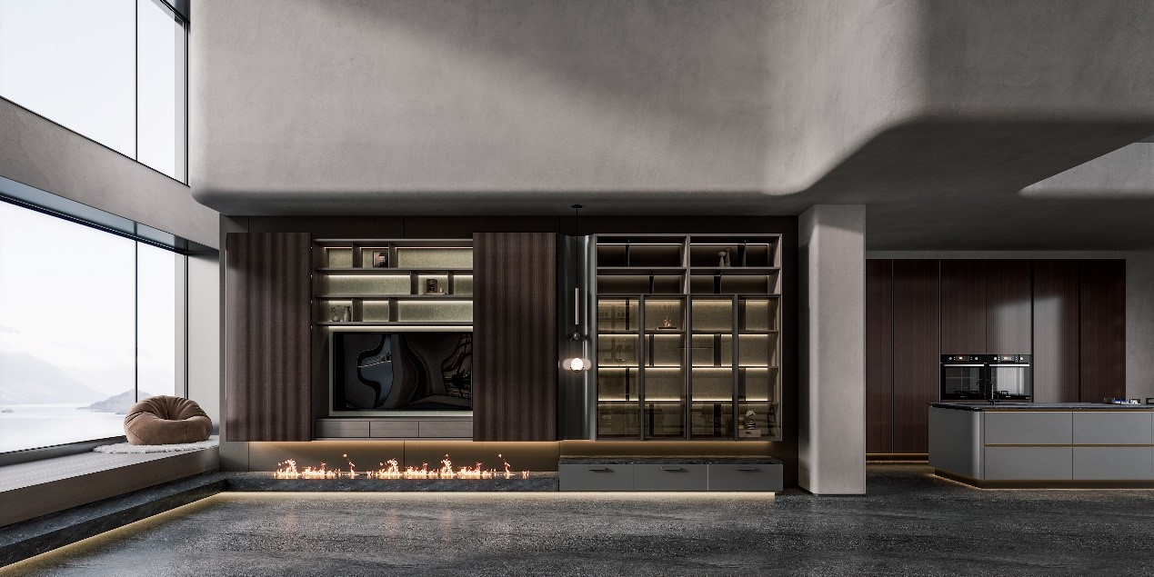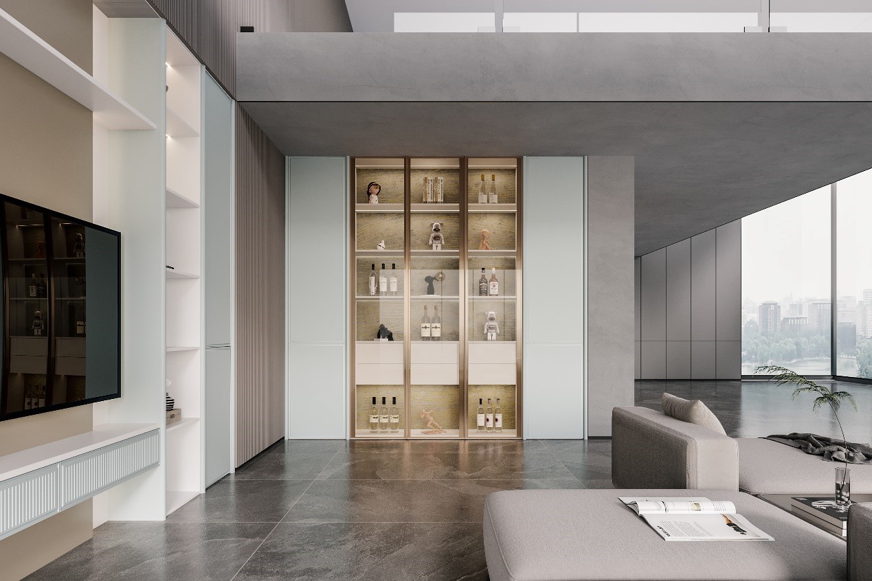 這套產(chǎn)品主要針對大平層的戶型設(shè)計,開放式的客廳,開放式的廚房,開放式的臥室,開放式的衣帽間,一種無拘無束的感受,也是當下年輕人比較鐘愛的生活方式。這款產(chǎn)品有兩大特點:幾何式的產(chǎn)品結(jié)構(gòu),讓產(chǎn)品構(gòu)建更加簡潔干凈;層板內(nèi)斜45度的工藝亮點,讓視覺感更加的聚焦,更加有內(nèi)部延伸感。