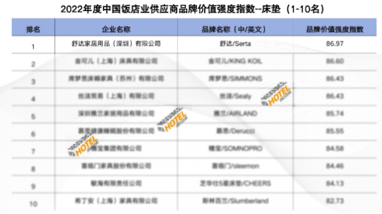 2023年2月24日,在江蘇省無錫市舉行的“第十四屆飯店采購(gòu)供應(yīng)年會(huì)”傳來好消息,舒達(dá)床墊以86.97高分在床墊品類排名中脫穎而出,榮獲“2022年中國(guó)飯店業(yè)供應(yīng)商品牌價(jià)值強(qiáng)度指數(shù)”床墊榜第一。事實(shí)上,舒達(dá)在上一年度同樣高居榜首。