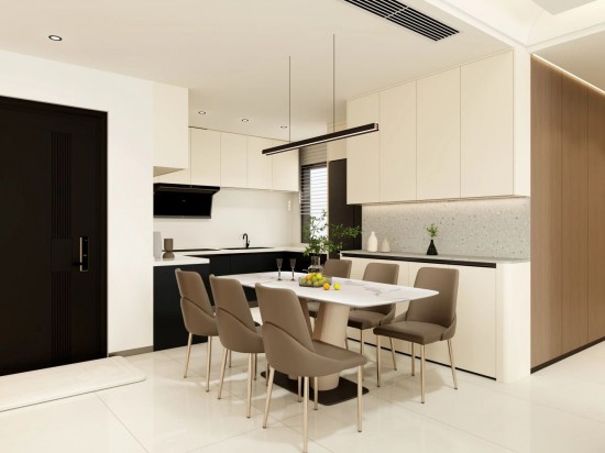 一半清歡,一半煙火,從客廳橫向延伸便抵達(dá)餐廚區(qū),設(shè)計(jì)采用了上淺下深的色彩搭配,既美觀又實(shí)用。餐臺(tái)的維多利亞白彩晶石臺(tái)面,如同皎潔的明月,光影中閃爍著璀璨的光芒,一抹綠色的生機(jī)注入,又激蕩出無限活力。右側(cè)的背景柜巧妙穿插了水磨石元素,既保證了空間的通透性,又劃分了不同置物區(qū)域,讓整體布局更加合理且富有層次。