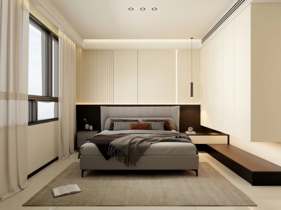 次臥的整體設(shè)計(jì)摒棄了傳統(tǒng)的奢華浮夸之風(fēng),以純白暖灰色調(diào)為主。無主燈的設(shè)計(jì)讓空間更顯簡潔,背景墻采用不同白色格柵板拼接裝飾,配合黑色高級(jí)質(zhì)感床頭柜,增添了空間的層次感和質(zhì)感。