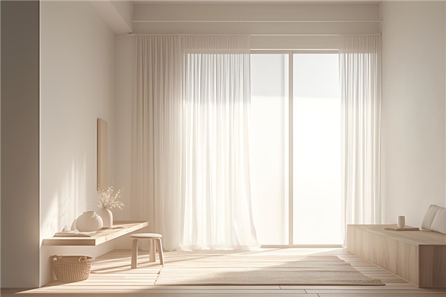 與原木色的家具、地板,奶白色的墻壁、落地窗簾