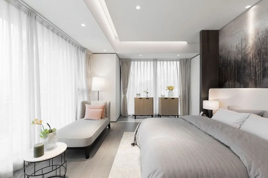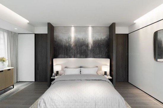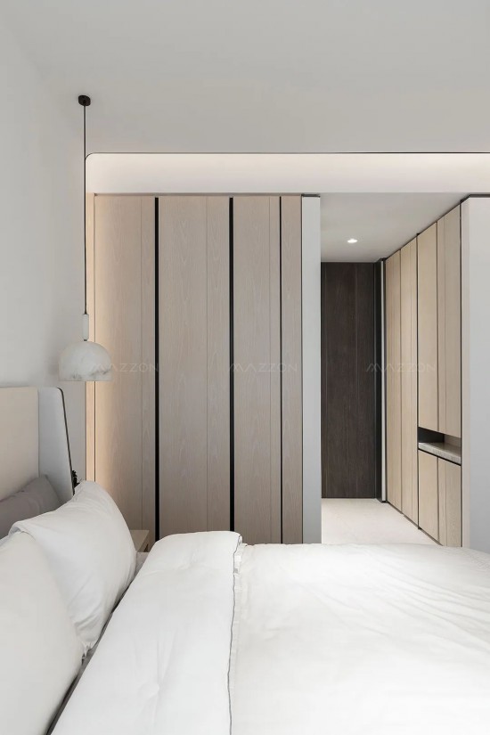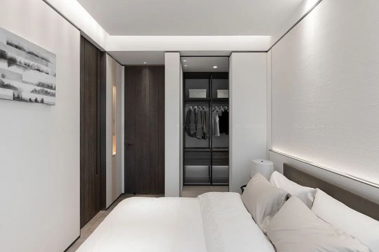 步入主臥,大面積的落地窗,每天清晨都能被窗外的極致美景所喚醒。頗具藝術(shù)審美的衣帽間,開放的布局,衣物整潔利落地?cái)[放,視覺所到之處,是屬于家庭的優(yōu)雅與體面。