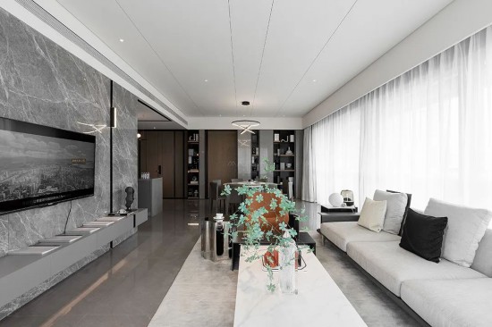 溫潤木質(zhì)搭配大理石,象征著劉先生的內(nèi)斂與自洽,“柔和的光線透過窗戶,窩在沙發(fā)里,沏上一杯淡淡的香茗,手捧一本沒看完的書,靜靜享受屬于自己的悠閑時(shí)光。”