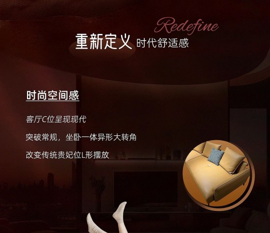 核心提示:客廳C位呈現(xiàn)現(xiàn)代,突破常規(guī),坐臥一體異形大轉角,改變傳統(tǒng)貴妃位L形擺放。