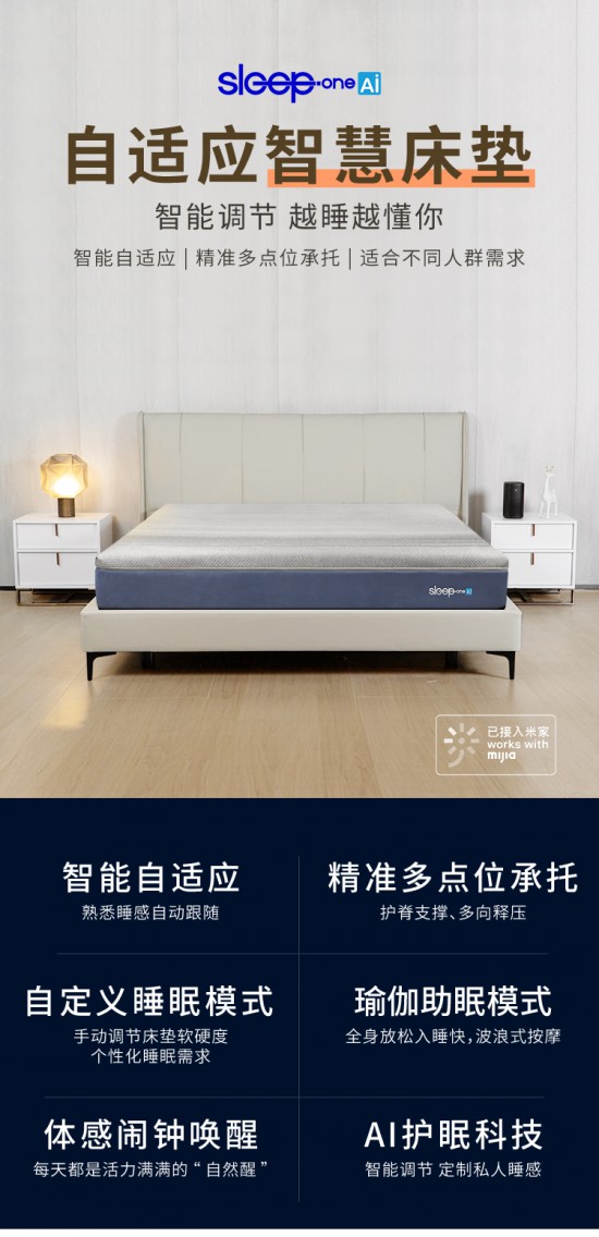 至于床墊,它不再只是簡(jiǎn)單的休憩空間,Sleepone Ai智能床墊以科技之名,重新定義舒適與健康。通過米家APP,可以自由調(diào)整床墊左右雙區(qū)包括背部、腰部、臀部的軟硬度,更有瑜伽助眠、定時(shí)體感鬧鐘、睡眠監(jiān)測(cè)等多種功能。無論是忙碌后的舒緩,還是失眠夜的溫柔擁抱,Sleepone Ai都能精準(zhǔn)智能響應(yīng),為您量身定制最佳睡眠方案。