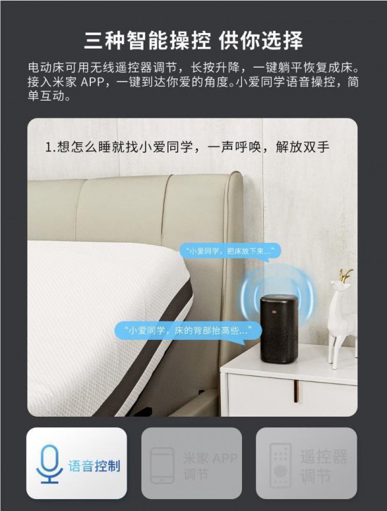 產(chǎn)品設(shè)備支持無線遙控器、米家APP和小愛同學(xué)語(yǔ)音控制三種智能操控,覆蓋您的隨心所選,用戶可以僅憑語(yǔ)音指令就能輕松調(diào)整床和床墊的狀態(tài)。多樣化的控制方式,旨在滿足不同用戶的個(gè)人喜好與個(gè)性化需求,確保每位用戶都能找到最適合自己的操作方式,享受量身定制般的舒適與便捷。