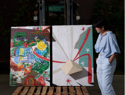 李蔓邀請年輕畫家“你好”一起用楓木皮創(chuàng)作的油畫作品
