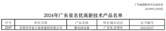 12月9日,廣東省高新技術(shù)企業(yè)協(xié)會(huì)正式公布了2024年廣東省名優(yōu)高新技術(shù)產(chǎn)品名單,東莞市華富立裝飾建材有限公司(以下簡(jiǎn)稱(chēng)“東莞華富立”)自主研發(fā)的華立激光封邊條憑借其卓越的技術(shù)水平和市場(chǎng)競(jìng)爭(zhēng)力成功入選,為公司的科技創(chuàng)新之路再添榮譽(yù)。