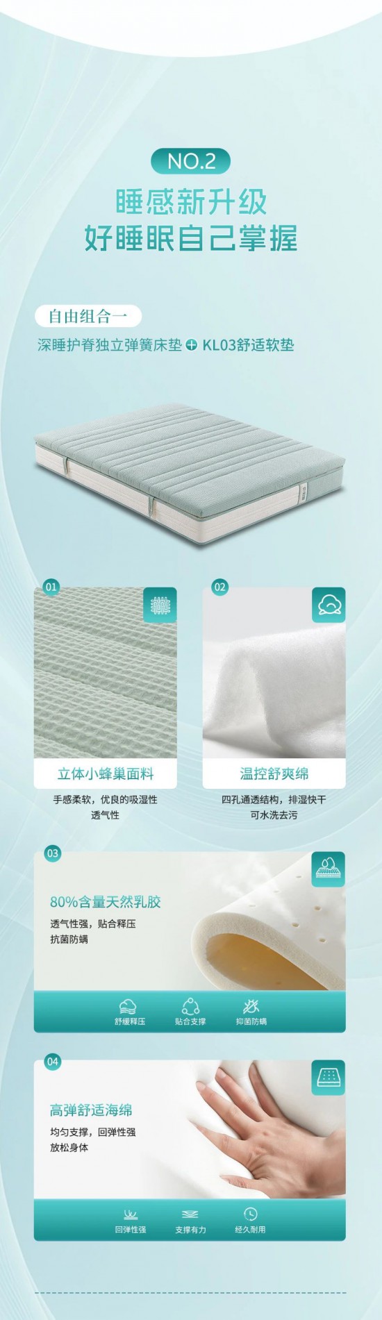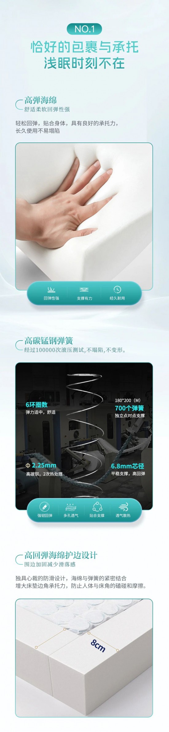核心提示:獨(dú)具心裁的防滑設(shè)計(jì),海綿與彈簧的緊密結(jié)合,增大床墊邊角承托力,防止人體與床角的磕碰和摩擦。