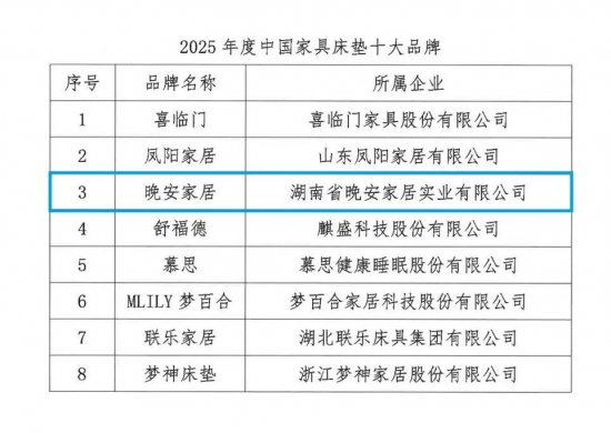 為帶動行業(yè)積極踐行國家品牌戰(zhàn)略,中國家具協(xié)會組織開展中國家具十大品牌評價工作,并通過媒體宣傳、展覽展示、路演推介等方式,覆蓋國內(nèi)外宣傳平臺,講述品牌故事,展現(xiàn)當(dāng)代中國家具創(chuàng)新力、發(fā)展力、增長力,參與全球高水平價值鏈競爭。根據(jù)《中國家具十大品牌評價管理辦法》,晚安家居集團在企業(yè)效益、品牌建設(shè)、質(zhì)量管理、科技創(chuàng)新等多項評價指標(biāo)中表現(xiàn)優(yōu)異,榮獲“2025年度中國家具床墊十大品牌”,這是對晚安家居集團綜合實力的充分肯定。