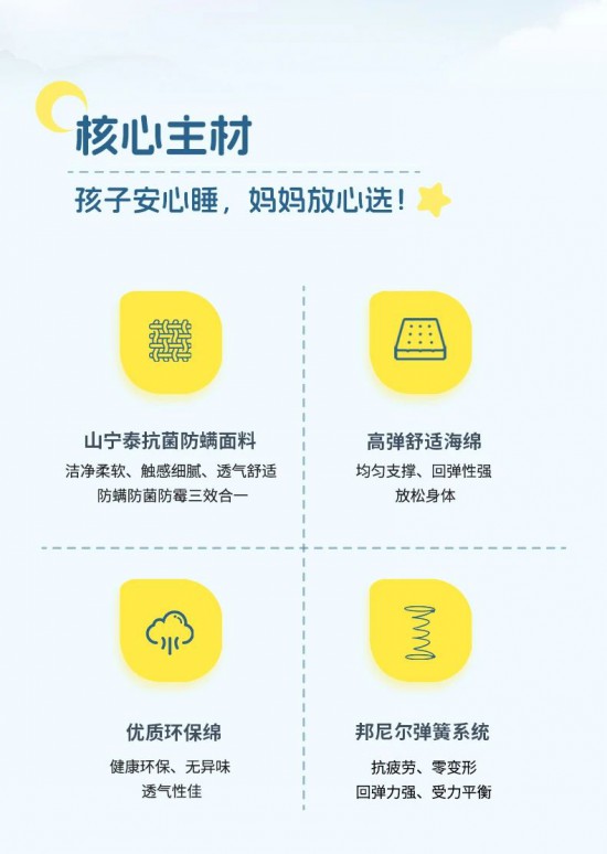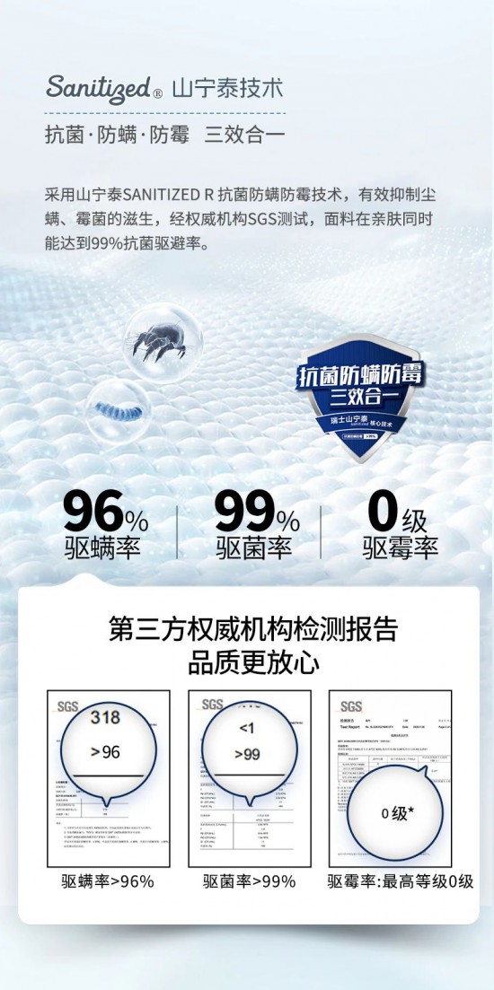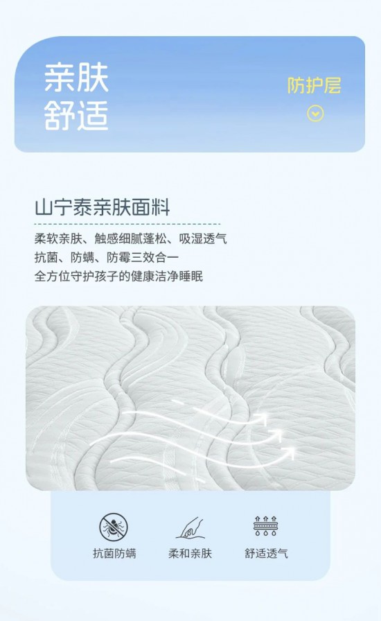 核心提示:山寧泰親膚面料,柔軟親膚、觸感細(xì)膩蓬松、吸濕透氣,抗菌、防螨、防霉三效合一全,方位守護(hù)孩子的健康潔凈睡眠。