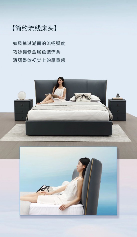 核心提示:簡(jiǎn)約流線床頭,如風(fēng)掠過(guò)湖面的流暢弧度,巧妙鑲嵌金屬色裝飾條,消弭整體視覺(jué)上的厚重感。