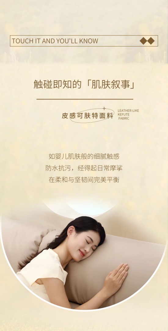 核心提示:皮感可膚特面料,如嬰兒肌膚般的細(xì)膩觸感,防水抗污,經(jīng)得起日常摩挲,在柔和與堅(jiān)韌間完美平衡。
