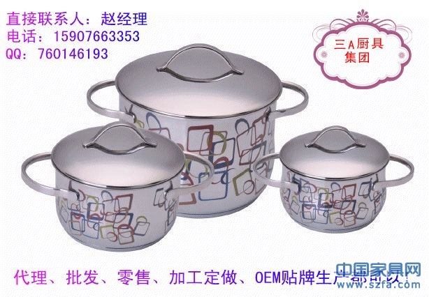 高檔不銹鋼廚具、湯鍋、炒鍋、煎鍋、奶鍋、蒸鍋、刀叉、碗筷碟子等眾多款式,批發(fā)、零售、代理還可以加工定做,OEM貼牌生產(chǎn)!廠家直銷!??!櫥柜、炊具等產(chǎn)品配套的最佳選擇!消費(fèi)者最愛的禮品,贈(zèng)品!