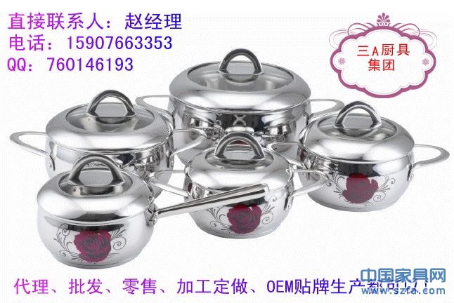 高檔不銹鋼廚具、湯鍋、炒鍋、煎鍋、奶鍋、蒸鍋、刀叉、碗筷碟子等眾多款式,批發(fā)、零售代理還可以加工定做,OEM貼牌生產(chǎn)!廠家直銷?。?!櫥柜、炊具等產(chǎn)品配套的最佳選擇!消費(fèi)者最愛的禮品,贈(zèng)品!