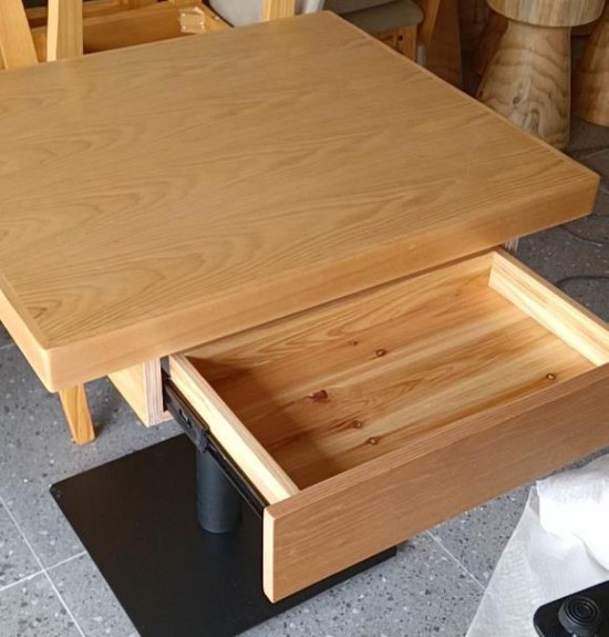 木桌子是夾板貼水曲柳面板,經(jīng)40噸冷壓機(jī),高壓壓平整,后經(jīng)5mm白臘實(shí)木封邊,原木色PU環(huán)保油漆處理,桌面防水清潔.桌面底部為啞白色,帶450*250*120mm活動(dòng)抽屜.可放紙巾,筷子,牙簽。8mm黑色防銹鐵板桌腳底盤(pán)配黑色防銹76mm管.