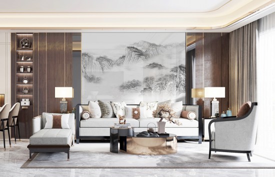 此系新中式客廳背景墻設(shè)計效果圖,包括:沙發(fā)背景墻和電視背景墻,更多裝修效果圖,請關(guān)注企業(yè)官網(wǎng):www.ykshu.cn
