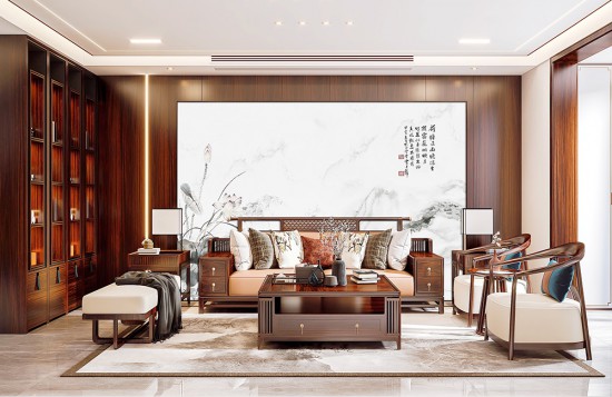 此系新中式客廳背景墻設(shè)計效果圖,包括:沙發(fā)背景墻和電視背景墻,更多裝修效果圖,請關(guān)注企業(yè)官網(wǎng):www.ykshu.cn