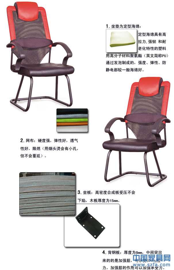 中鋼鋼管材,弓形架管直徑25mm,管壁厚1.50mm, 背架管直徑16mm,管壁厚1.50mm,背坐連接鋼板寬100mm,厚8.0mm,沖壓加強筋,坐墊木板厚度15mm,廣西優(yōu)質(zhì)辦公專用曲木板,超柔高彈定型海綿,優(yōu)質(zhì)尼龍網(wǎng)布,坐墊為耐磨西皮,頭枕為優(yōu)質(zhì)環(huán)保皮,扶手為PP塑膠扶手,完全可通過測試。
