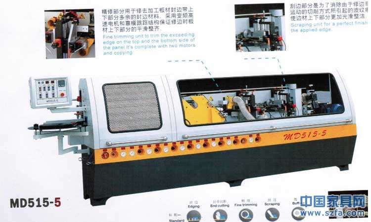 本機(jī)床能從板材送入后自動(dòng)完成:粘接封邊、前后齊頭、上下平修(此項(xiàng)功能僅限MD515-6)、上下精修、上下刮邊(此項(xiàng)功能僅限MD515-5及MD515-6)、上下拋光六種功能,避免了手動(dòng)加工過程中出現(xiàn)的加工誤差,保證了加工尺寸的一致性。本機(jī)床自動(dòng)化程度高、封邊質(zhì)量好、生產(chǎn)效率高,并且造型美觀、結(jié)構(gòu)緊湊、工作穩(wěn)定可靠,是板式家具生產(chǎn)廠家使用的重要設(shè)備之一。