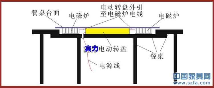 | 4、可配電磁爐的電動(dòng)轉(zhuǎn)盤(pán)安裝圖如下:注:此款電動(dòng)轉(zhuǎn)盤(pán)內(nèi)配電刷,可外送220V交流電。 |