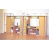 結(jié)構(gòu):由床、書柜、衣柜、書桌和梯架組成。書柜和衣柜連接在床架床腿內(nèi)側(cè),書桌將書柜、衣柜連在一起,床架有書柜的一頭安裝有梯架,床架的另一頭與梯架同側(cè)有護欄,書桌的桌面下有鍵盤支架和抽屜架。由于床是立體空間組合,不僅節(jié)省了宿舍的空間,而且使宿舍整齊美觀。