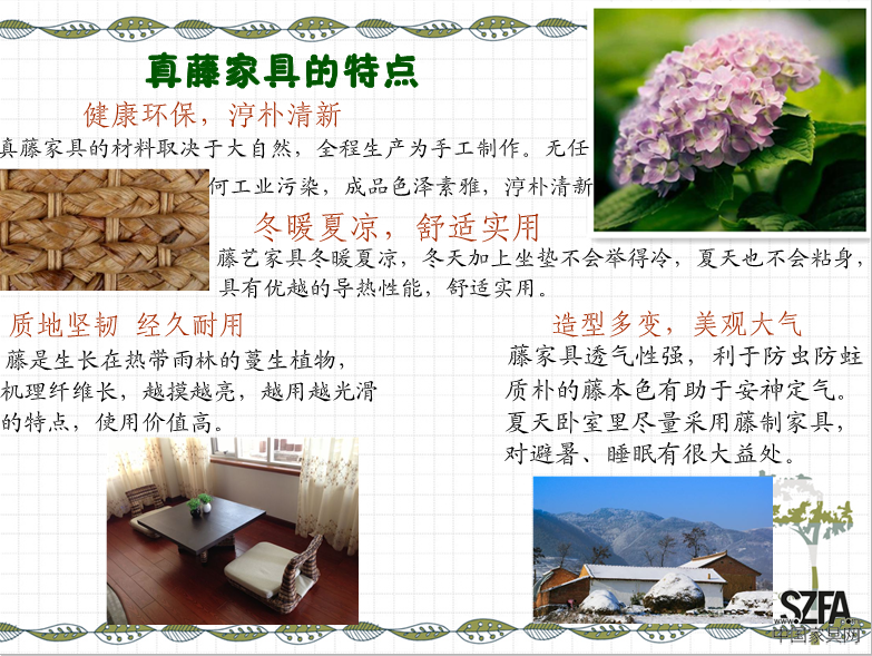 藤家具不僅健康環(huán)保、自然清新,還兼具了透氣性好、舒適實(shí)用等特點(diǎn)。隨著節(jié)能環(huán)保意識(shí)的逐步增強(qiáng)及返璞歸真、回歸自然風(fēng)潮的日趨流行,各類藤藝家具日漸走入千萬(wàn)家庭。藤藝家具可以 說(shuō)是四季常用的理想選擇,冬暖夏涼,非常方便。冬天加上坐墊既不會(huì)感覺(jué)到冷,夏天坐上去也不會(huì)有粘身的感覺(jué)。