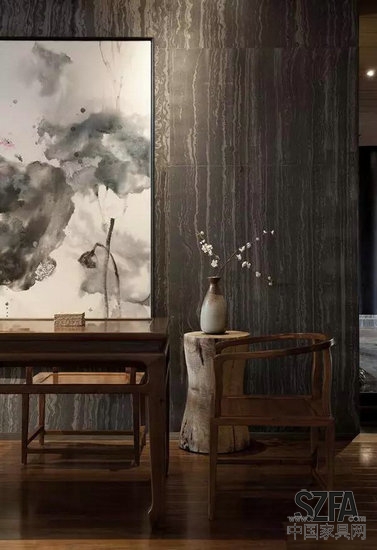 我們追求的是表面的質(zhì)感和肌理,不同質(zhì)感和肌理的材質(zhì)對(duì)比正如同不同形體體塊的互相對(duì)話,為了暖和硬朗的材質(zhì),設(shè)計(jì)師在細(xì)節(jié)之處為用心,無論是走道上看似隨意擺放的佛像、枯枝,還是那些做工精良的中式家具、置于展示柜內(nèi)的精美瓷器與茶具,這些細(xì)微之處的累積都讓空間顯得更為飽滿。