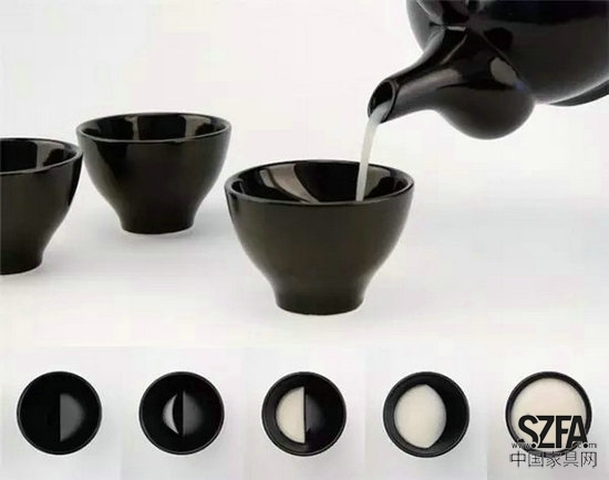 韓國設(shè)計工作室Tale運用月相原理創(chuàng)造的優(yōu)美月相碗/Moon Glasses 。每個陶瓷碗的內(nèi)部都個凸起、形成一個緩坡,所以液體在碗中的不同高度都會形成不同的形狀,完美模仿了美麗的月相變化,其中用白色的茶點/飲料或者傳統(tǒng)的黃酒最為合適,看似簡單、實則巧妙。