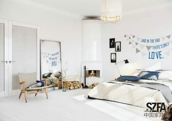 墻壁上大大的“Love”字樣讓人覺得暖心,舒適的沙發(fā)椅、床邊的整理箱和角落的擺件都讓臥室顯得隨意休閑。并不顯眼的壁爐足夠溫暖,木材整齊地堆砌在地上,增加了濃郁的生活氣息。