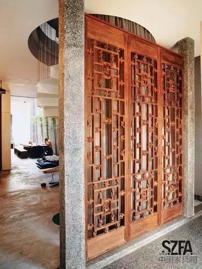 將屏風(fēng)稍做變形后,或翻轉(zhuǎn),或推拉,置于墻面之中,直接作大門之用。