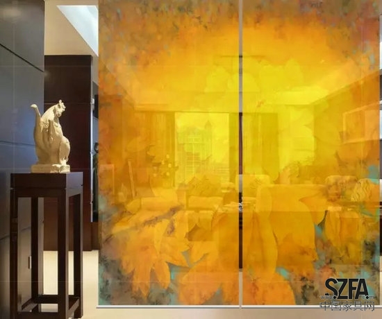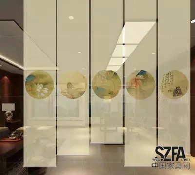 現(xiàn)今,也有仿照掛屏的形式,利用可旋轉(zhuǎn)的玻璃,上下固定于地面及天花板。既有裝飾作用,又可直接作為門或隔斷。