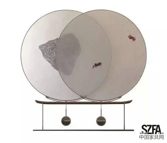 如此款座屏,座皆由細(xì)而輕的條狀構(gòu)成。支撐兩面圓形的屏,獨(dú)特、別具一格。凸顯出了新中式的裝飾韻味。