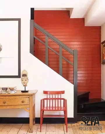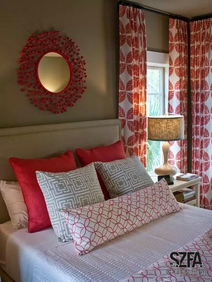 這里,中國紅出現(xiàn)在臥室色彩上。紅色跟黑色是常見的搭配色,為了緩和兩種濃重色彩帶來的壓抑感,適當(dāng)?shù)陌咨珌碜鰹橹虚g的調(diào)和色。