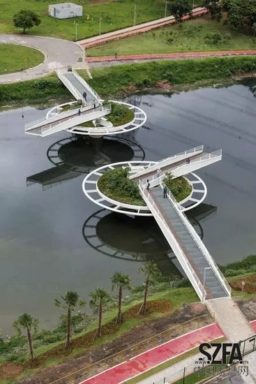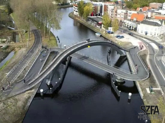這座橋的設(shè)計可謂創(chuàng)新大膽,好像兩個圓形的大轉(zhuǎn)盤,那四條橋身就像四根指針,指向不同的方向,不同的是,中間兩條稍短的橋身看起來可以隨意轉(zhuǎn)動,沒錯,它們真的可以轉(zhuǎn)向任何方向供人們散步觀光,當(dāng)然也可以連接到一起拼成一整條直線的橋,讓行人來往于小河兩岸。