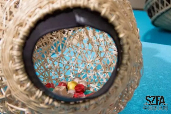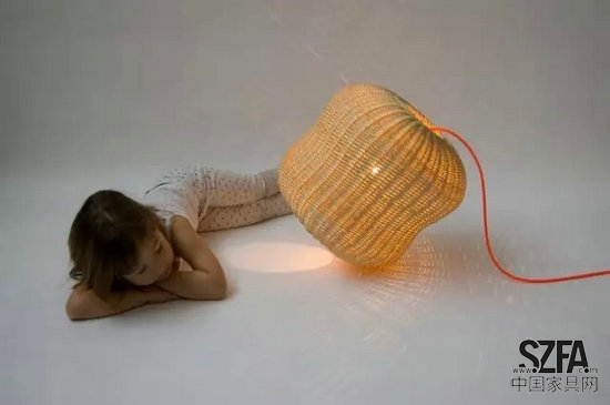 柳條編織的小夜燈。由于設(shè)計師對植物、水果、貝殼這些自然界里擁有漂亮的三維形態(tài)的生物的喜愛,這個小夜燈的形狀本來是以海膽為原型的,但受到柳條這種材料本身性質(zhì)的限制,最終的效果反而更像是一個大花生。光線透過柳條編織的縫隙泄露出來,柔和且美麗。